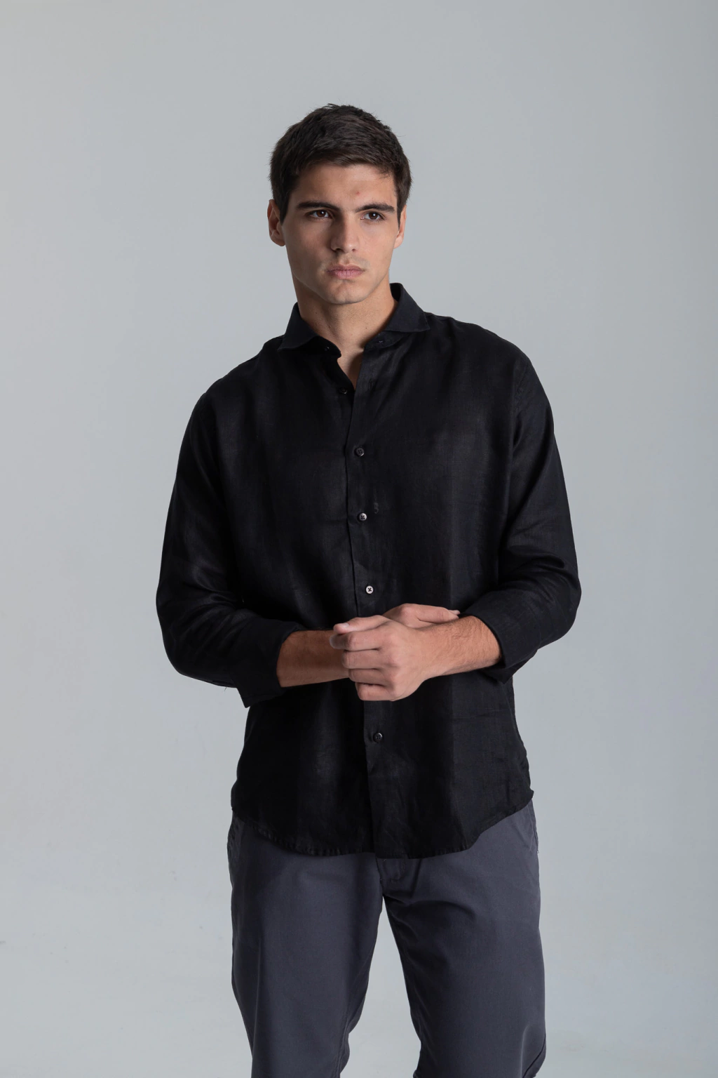 Esta camisa está confeccionada en 100 % lino de grosor medio. Tiene cuello clasico y corte regular , botonadura frontal.Un clásico destacado en la comodidad y versatilidad .