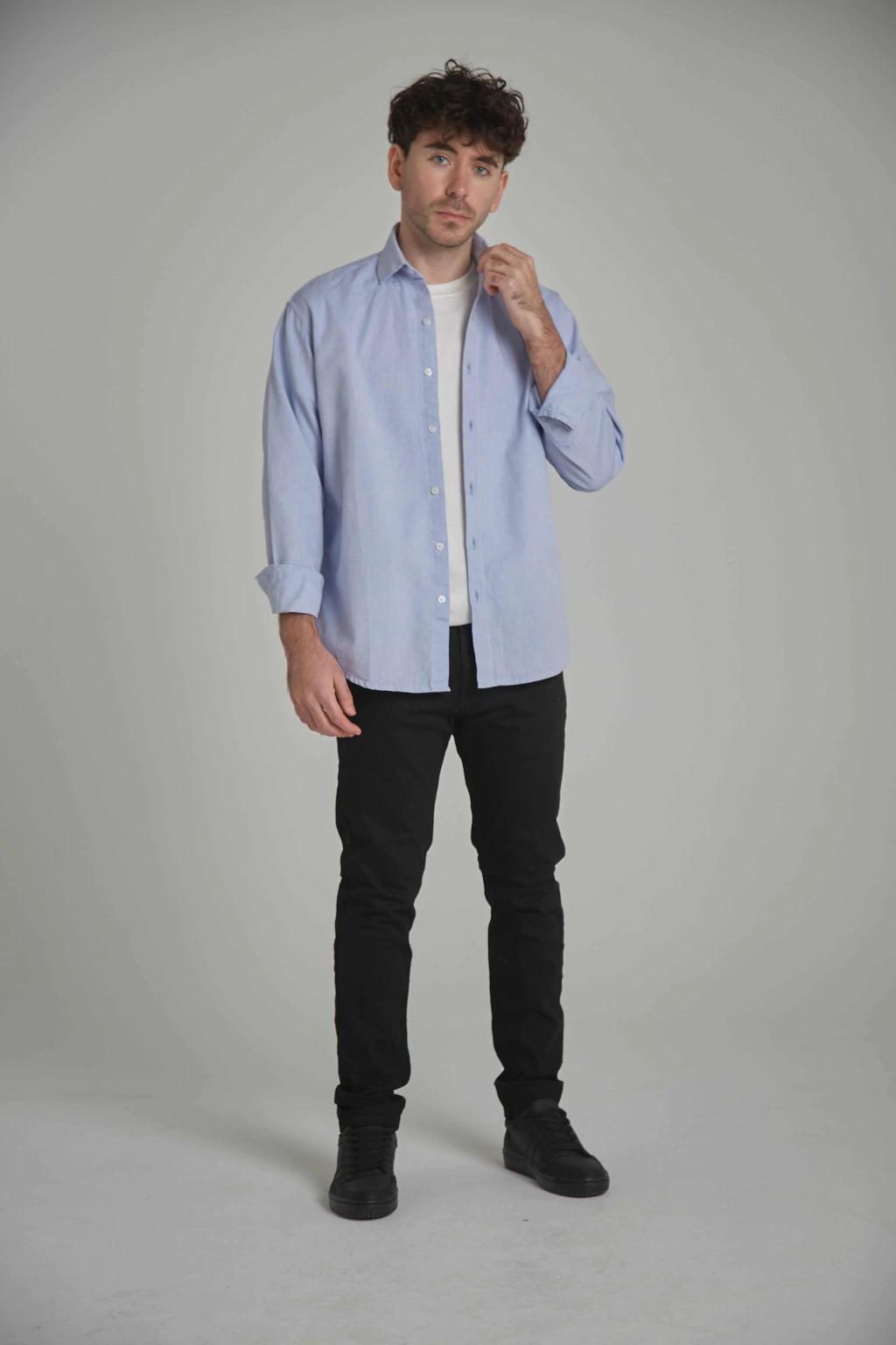 Esta camisa está confeccionada en tafetan 100 % algodón de grosor medio. Tiene cuello clasico y corte más amplio que las camisas convencionales, botonadura frontal y en puños. Un clásico reinventado para el día a día y con la autenticidad perfecta para ocasiones especiales.